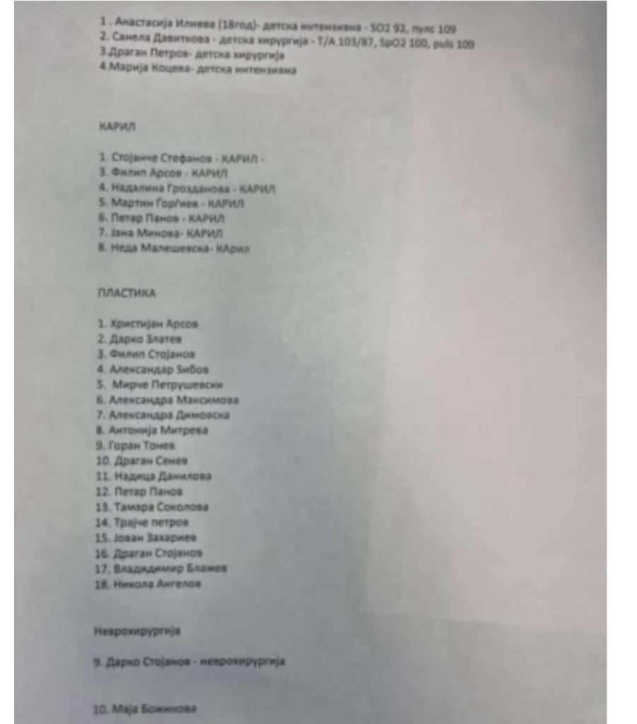 Dy persona janë në Kirurgji Pediatrike, dy në Pediatri, tetëmbëdhjetë persona janë duke u trajtuar në Klinikën e Kirurgjisë Plastike në Shkup, tetë në Klinikën e Anestezisë KARIL, 2 në Klinikën e Neurokirurgjisë dhe një person në Ortopedi.