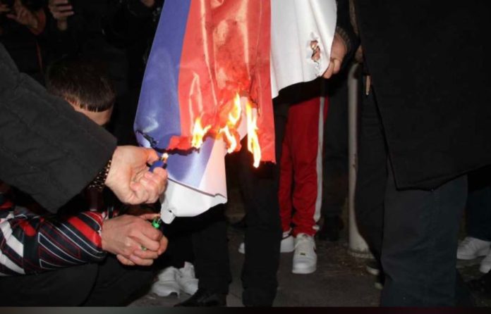 Personat e shoqëruar, gjatë zhvillimit të protestës pasditen e djeshme, në bulevardin “Dëshmorët e Kombit”, para Kryeministrisë, kanë djegur katër flamuj kombëtar të Serbisë.