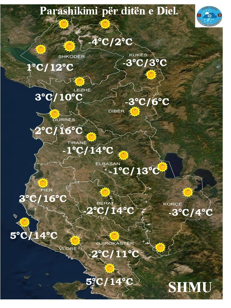 Moti pritet të jetë i kthjellët e vranësira të pakta e mesatare kryesisht ditën e shtunë në relievet malore, ndërsa ditën e diel mot i kthjellët e vranësira të pakta kalimtare.