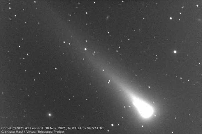 ”E zbuluar më 3 janar të këtij viti, kometa C/2021 A1 Leonard, ose më thjesht kometa ‘Leonard’, kishte lënë të kuptohet menjëherë se kishte mundësinë të bëhej mjaft e shndritshme dhe ndoshta të arrinte pragun e dukshmërisë me sy të lirë pak para mesit të dhjetor. Dhe kështu ishte”, komentoi astrofizikani Gianluca Masi, kreu i ”Teleskopit Virtual”.