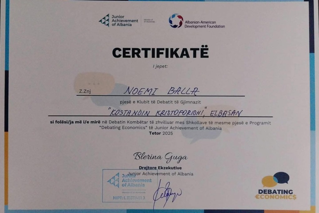 Noemi Balla, maturante ekselente e gjimnazit “Kostandin Kristoforidhi”, u vlerësua si debatuese më e mirë në Debatin Ekonomik Kombëtar midis shkollave të mesme të Shqipërisë, organizuar nga Junior Achievement Albania.