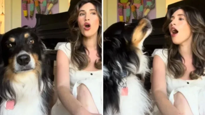 Videoja tregon 31-vjeçaren, Lauren Paley që këndon “Hymn to the Sea”, kolona zanore e filmit ikonik “Titanic” dhe qeni i saj, Oliver, një pastor australian që i “bashkohet” sikur kishte një jetë që e njihte këngën.