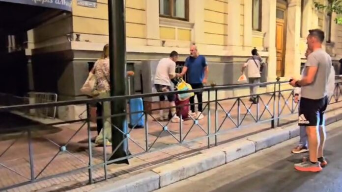 Të habitur kalimtarët e paktë që kalonin në rrugën ” Leoforos Vasilisis Sofias” rreth mesnatës, panë turistët e egërsuar të dhunojnë taksistin duke refuzuar të paguajnë.