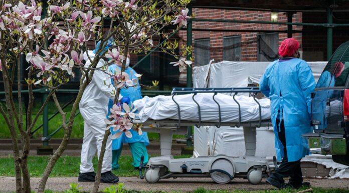 NEW YORK, NY – APRIL 8: Kingsbrook Jewish Medical Center employees transport a deceased patient to a refrigerated truck on April 8, 2020 in the Brooklyn borough of New York City. One of the city’s hardest impacted hospitals due to the coronavirus (COVID-19), Kingsbrook has begun storing the bodies of the the deceased in refrigerated trucks. (Photo by David Dee Delgado/Getty Images)